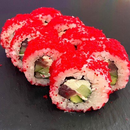 Угорь, творожный сыр, огурец свежий, фирменный рис, лист нори, стружка тунца.
