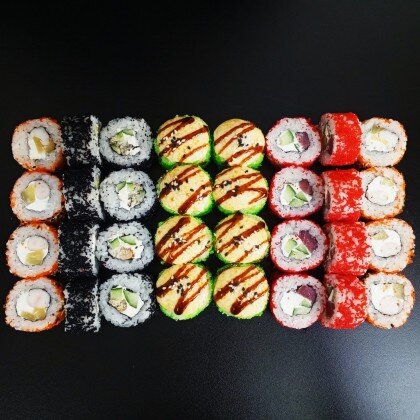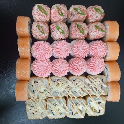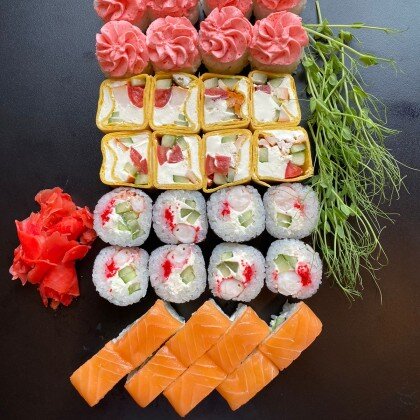 Филадельфия Лайт(8шт), калифорния с тунцом(8шт),восходящее солнце (8шт),лава с крабом(8шт),соевый соус 1шт,васаби 1шт., набор палочек (1шт).